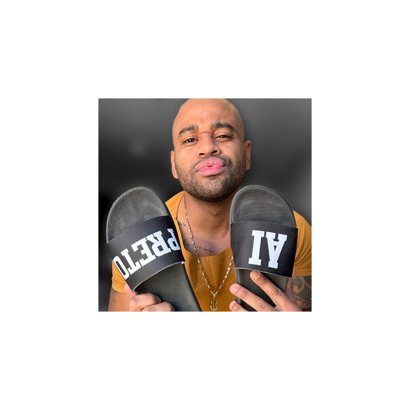 Inspirada nas caminhadas pela orla do litoral brasileiro e o carísma de Cezar Black, este chinelo slide-on tem tira larga única em borracha macia, que envolve o pé, com a gravação AI PRETO.