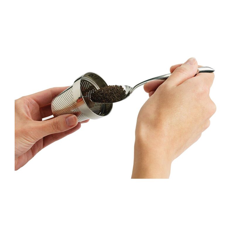 Basta encher o cesto de aço inoxidável micro-perfurado com as folhas soltas de chá, prender a tampa e fazer a infusão.